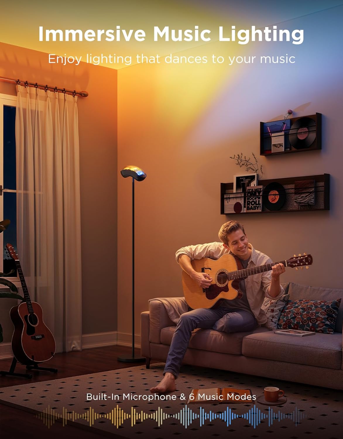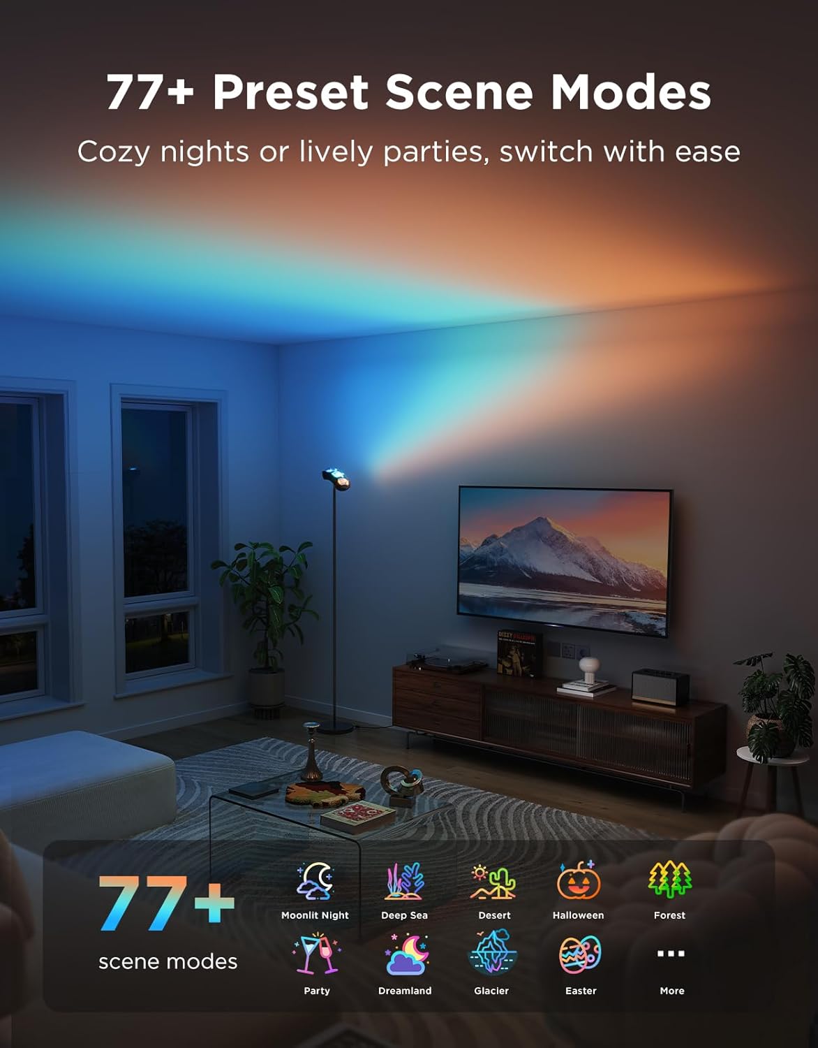 - Govee-Exclusive Scene Engine: Govee LuminBlend tech delivers richer soft lighting options and 77 preset modes. The smart floor lamp features 6 specialized music modes—ideal for home or media rooms.
